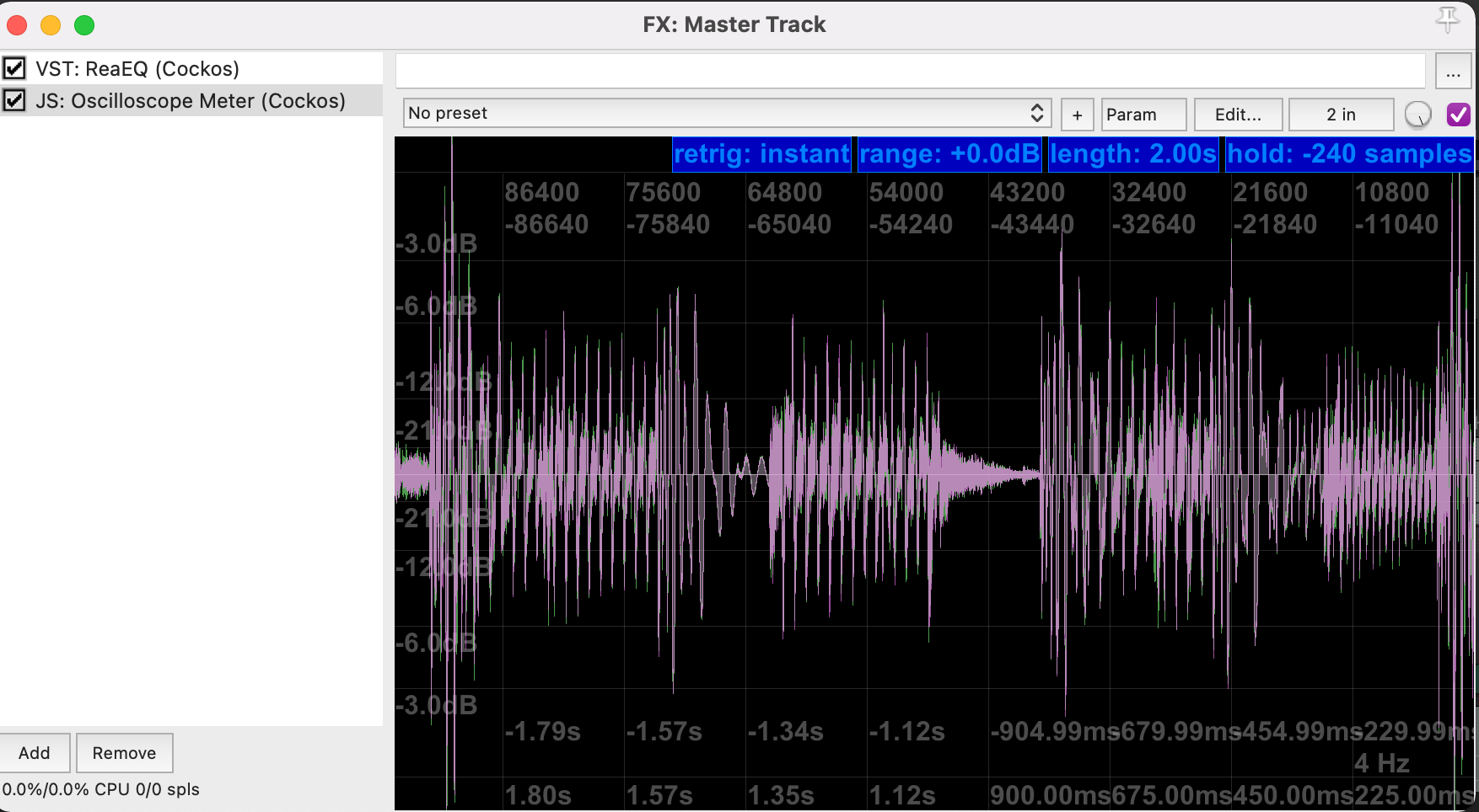 The oscilloscope allows us to sort out this conflict between loudness and fidelity, navigating through the best of both worlds. Mixing may be done with the ears, but the oscilloscope gives the eyes important clues about about how well we’re filling the mix out. It allows us to empirically test how our mixing decisions affect the fatness of the mix’s waveform. By watching the oscilloscope as you shape elements and mix them in, you can see how your choices are contributing to the overall volume while aurally confirming that it still sounds right. That means you can visually see that you are building that sausage waveform organically, minimizing the amount of squashing the final limiter has to do.